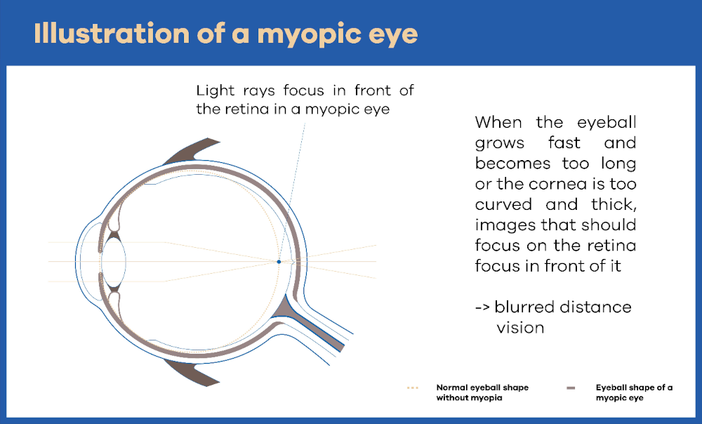 Myopia occurs when the eyeball grows too long, causing distant objects to appear blurry. In childhood, this axial elongation tends to progress most rapidly between ages 5 and 19.