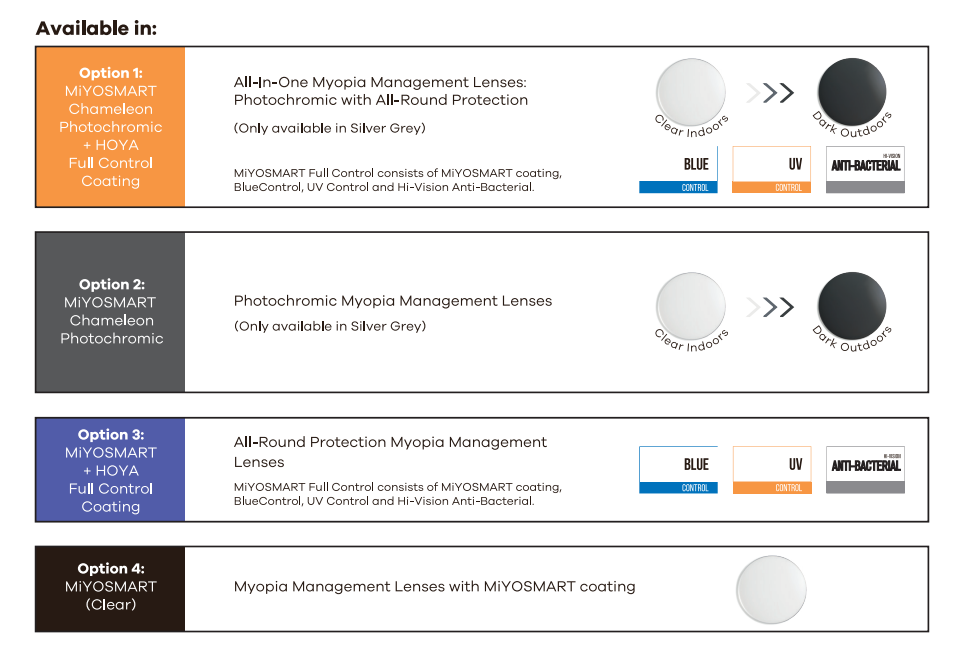 Introducing MiYOSMART Chameleon Photochromic with HOYA Full Control Coating – the all-in-one solution for parents looking to manage their child’s myopia while offering enhanced protection for their eyes.